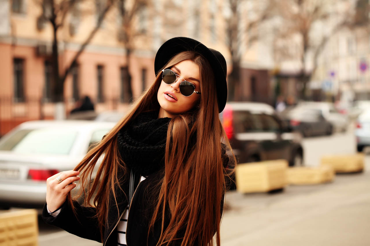 Outdoor fashion image of stylish beautiful brunette young woman wearing scarf, sunglasses and vintage hat, walking on the street.